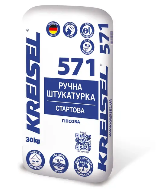 571 KREISEL Ручна штукатурка стартова, гіпсова, 5-30 мм (мішок 30 кг)